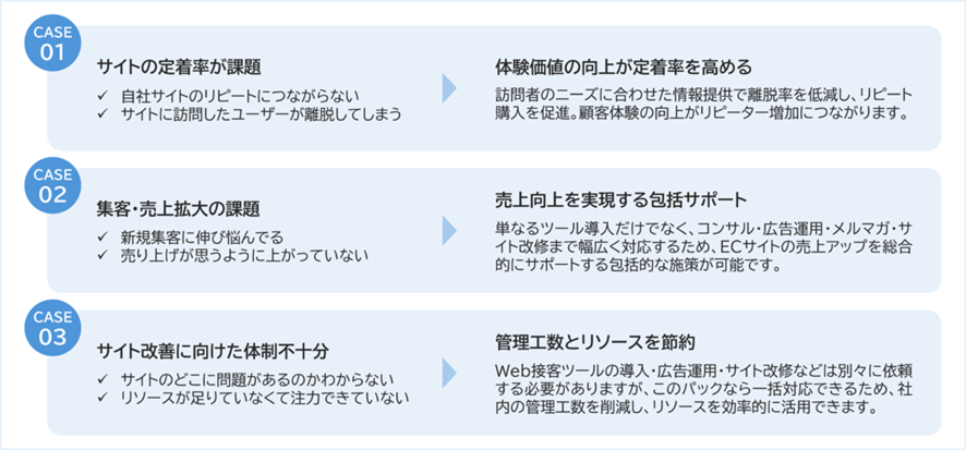 ECサイト運営者様の“こんな悩み”をまとめて解決。サイト改善・広告運用・接客強化を一括支援するプランです。